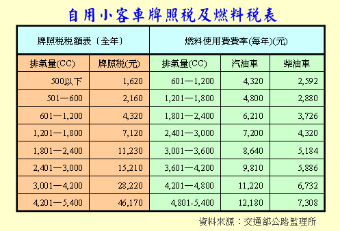 買車時,除了需考量省油因素外,汽車本身的牌照稅及燃料稅,也是一項重要的參考依據。排氣量越大的車子,所需支付的稅金也越高。以小客車使用牌照稅為例,目前依排氣量高低,共區分為8種課稅級距,最貴的一年可以課到46,170元,而最便宜的只要1,620元,兩者之間一差就是44,550元,影響不可謂不大,不想支付這種冤枉錢的人,可以考慮選購C.C.數較小的車子。