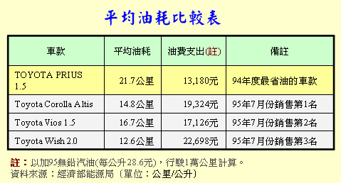 依據經濟部能源局94年度油耗測試統計結果顯示,去年度台灣汽車市場中最省油的車款就是「TOYOTA PRIUS 1.5」。這台車平均每加1公升的汽油,可以跑21.7公里。汽車日報經理蔡至兼就指出:PRIUS是屬於油電共生(hybrid)的車種,利用汽油及電力兩種動力來源,做為車輛行駛之用,當然相對省油。目前國內除了該款外,還有Ford ESCAPE 的一款進口車,也是採油電共生的架構,主因是SUV耗油高,以電力降低油耗。