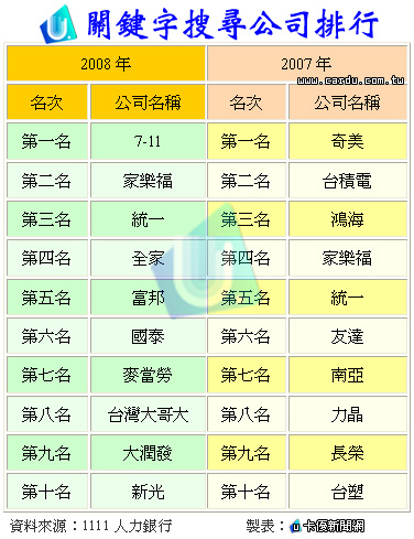 2007、2008年關鍵字搜尋公司排行比較,如下表: