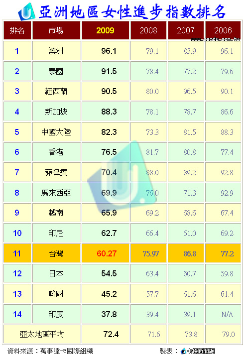 本週日就是三八婦女節,雖然近年來女權高漲,職場上成功女性的例子也越來越多,但從萬事達卡國際組織每年公佈的「女性進步指數」調查來看,台灣地區分數卻直直落,由去(97)年的75.97分跌至今年60.27分,退步幅度在亞太地區僅次於菲律賓,在十四個參與調查市場中,竟排名第十一名,倒數第四。