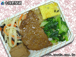 豬排便當的主菜是醬燒豬排,配菜包括香蔥烤蛋、油豆腐、筍簽、炒青菜和辣菜脯。3月11日前到OK超商購買便當、麵類或燴飯、炒飯等熱食,加5元再送光泉茉莉茶園蜜茶或清香蜜菊400ml一瓶。
