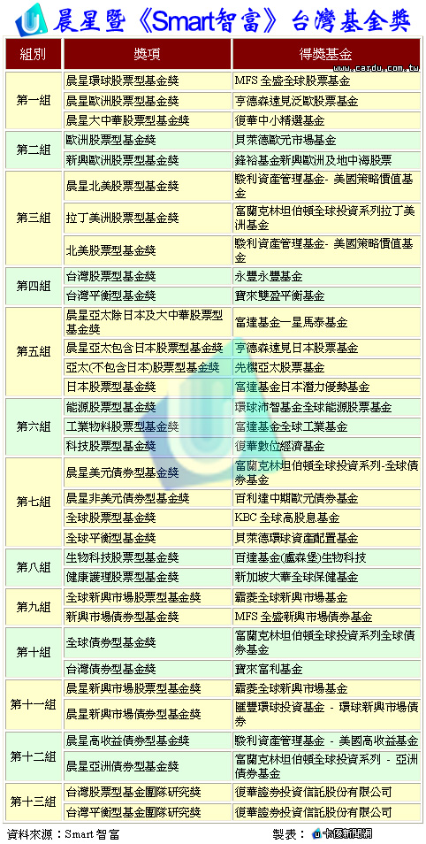 晨星暨《Smart智富》台灣基金獎得獎名單,如下表: