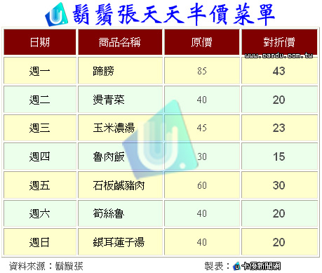 在4月9日之前,週一至週日,鬍鬚張天天推出不同菜色,只要在店內用餐,全天不限時段即可享有半價的優惠。