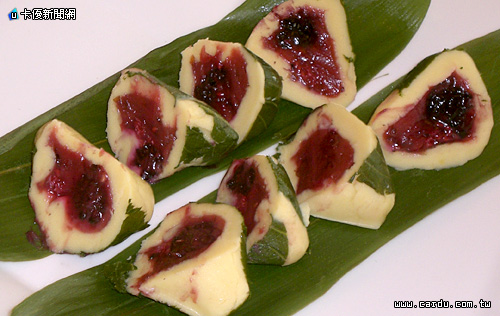 點心坊主廚許世國當年首創冰粽後,造成吃冰粽的風潮,其他業者也競相推出冰粽,今年他又有全新創意,把綠豆糕與糯米製成的雪莓娘皮,推出新潮的櫻葉芙蓉粽,強調外皮有入口即化的口感。