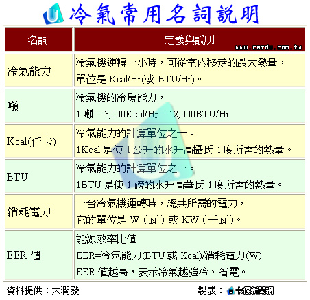 而冷氣的冷房能力單位,可分成兩種,一種是BTU,另一種是Kcal。Kcal是公制標制,而BTU是屬於英制標示,1Kcal約等於4BTU。而各大賣場也會標示房間坪數大小所需要的冷房能力,一般來說3~4坪需要7,200 BTU、5~7坪需要10,000 BTU、11~14坪需要22,400 BTU。