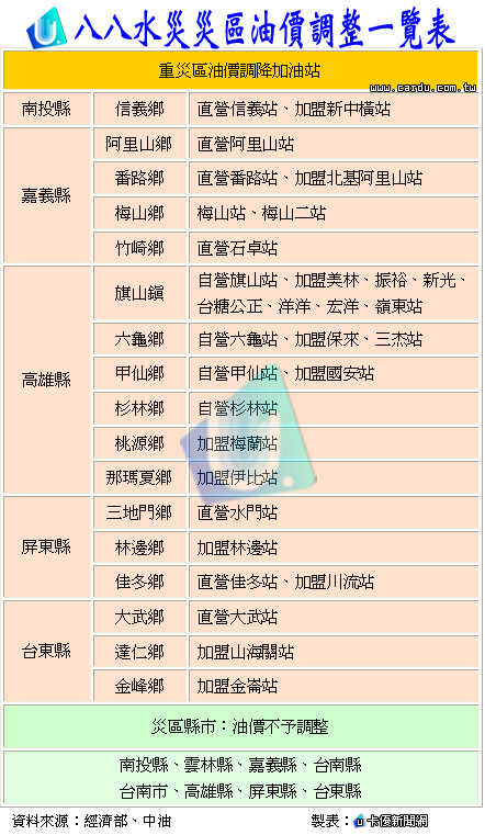 至於依政府宣布成立災後重建的南投縣、雲林縣、嘉義縣、台南縣、台南市、高雄縣、屏東縣及台東縣等8個縣市,本週油價則不調漲。