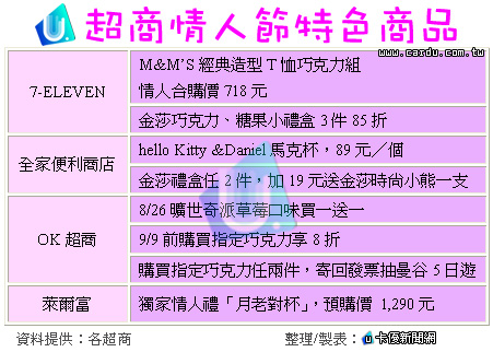 討好情人不一定要花大錢,今(98)年7-ELEVEN推出多款七夕情人節巧克力商品,包括M&M’S經典造型T恤巧克力組,情人合購價2件718元、金莎巧克力與糖果小禮盒3件85折。還有七夕Hello Kitty造型鑽石糖果盒、草莓棉花糖巧克力、明治花蝶版牛奶巧克力以及金莎巧克力星形禮盒、朗莎精品黑巧克力等特色商品,價格從35~389元不等。