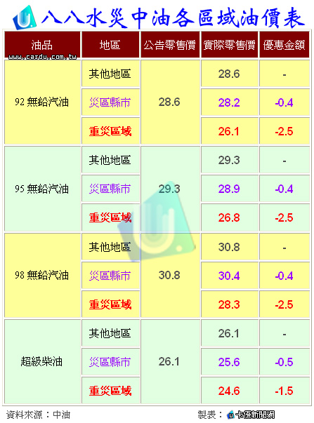 災區縣市汽、柴油依公告零售牌價每公升各優惠0.4元及0.5元。92無鉛汽油每公升28.2元、95無鉛汽油28.9元、98無鉛汽油每公升30.4元、柴油25.6元。