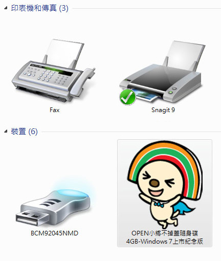 這次預購的贈品「OPEN小將」隨身碟(4G),可支援Windows 7「Device and Printer」功能,使用者將「OPEN小將」插入USB槽,電腦就會自動跳出「裝置印表機」頁面。最特別的是,所顯示的並非一般「卸除式硬碟」的死版圖示,而是會出現可愛的「OPEN小將」圖片。