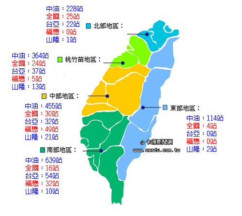 大台北地區(228站)、桃竹苗地區(364站)、中部地區(455站)、南部地區(639站)、東部地區(114站)