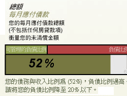 例如25歲的李先生,月薪3萬元,沒有其他福利津貼、投資所得或其他政府補助,目前負擔的債務共有助學貸款30萬元,預計2年內還清,「衡量未清償金額」此測驗計算出每個月應負的債務款項為1萬2500元,以「收入比例試算表」來計算,債務比例為33%,而MasterCard 財富管理大師提醒消費者,債務比例勿超過收入的20%,由此可見,李先生的負債比例則是過高。